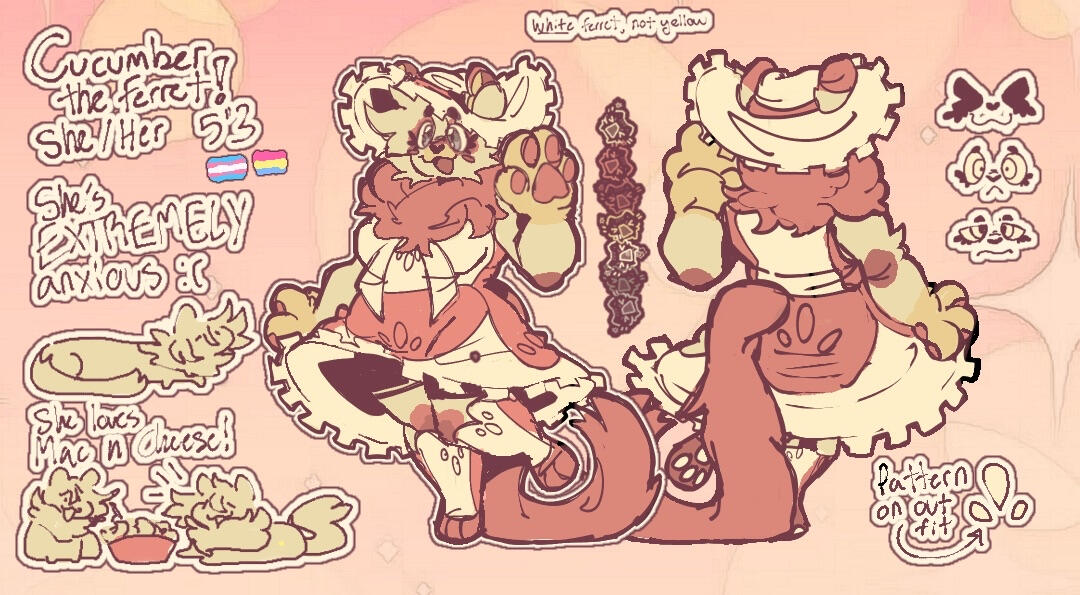 Cucumber is a very gentle and innocent lady. She tries her best to be nice and helpful towards everyone around her, but in new environments and new people she can break down with anxiety. She works a plain office job to waste some time, despite her having a lot of money she likes to not be treated differently because of that. But her tastes in the finer things can show with her wearing fancy clothes and eating many different foods. Especially with food she loves eating, it always calms her down especially her favorite food mac and cheese!